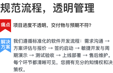 从项目启动那一刻起,您就拥有专属的在线客服和项目经理。随时同步进度、反馈问题,沟通简单高效,让您完全掌握项目脉搏,享受“甩手掌柜”般的轻松